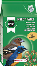 Orlux Insect patee je kompletna hrana za sve ptice koje jedu insekte. Ona je također dodatna hrana za tropske i domestificirane ptice, male, srednje i velike papige i lorije. Insect patee je vrlo bogata životinjskim proteinima i sušenim insektima, mravljim jajima te meksičkim larvama. Sadrži minimalno 25% insekata. Zahvaljujući velikoj količini sušenih insekata, ova je hrana savršeno pogodna za vrijeme perioda parenja europske faune.